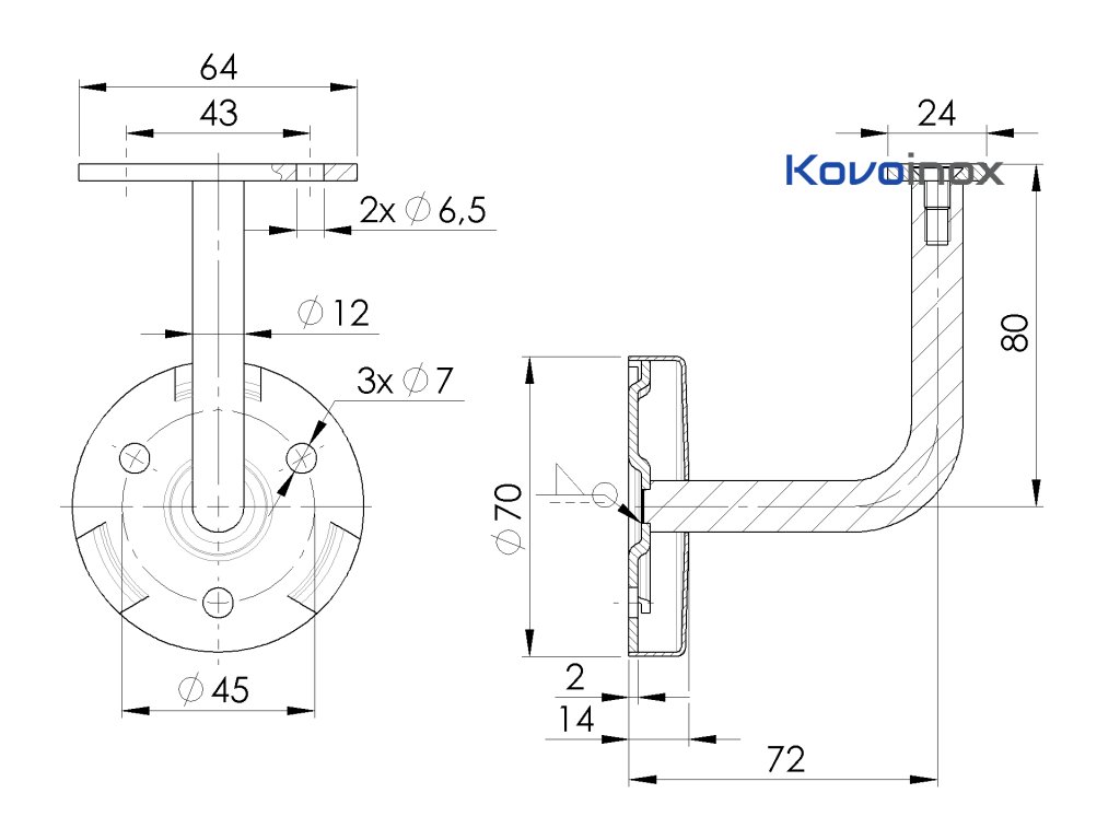 Držiak madla na stenu s krytkou platne na jakel/plochý, brúsený povrch K320/nerez AISI304