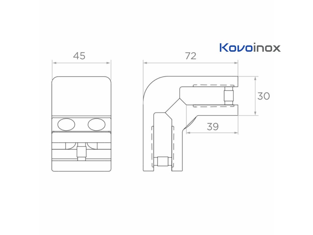 Svorka skla rohová 90˚ (72x45x30mm), na sklo 8-12.76mm, brúsený povrch K320/ nerez AISI304