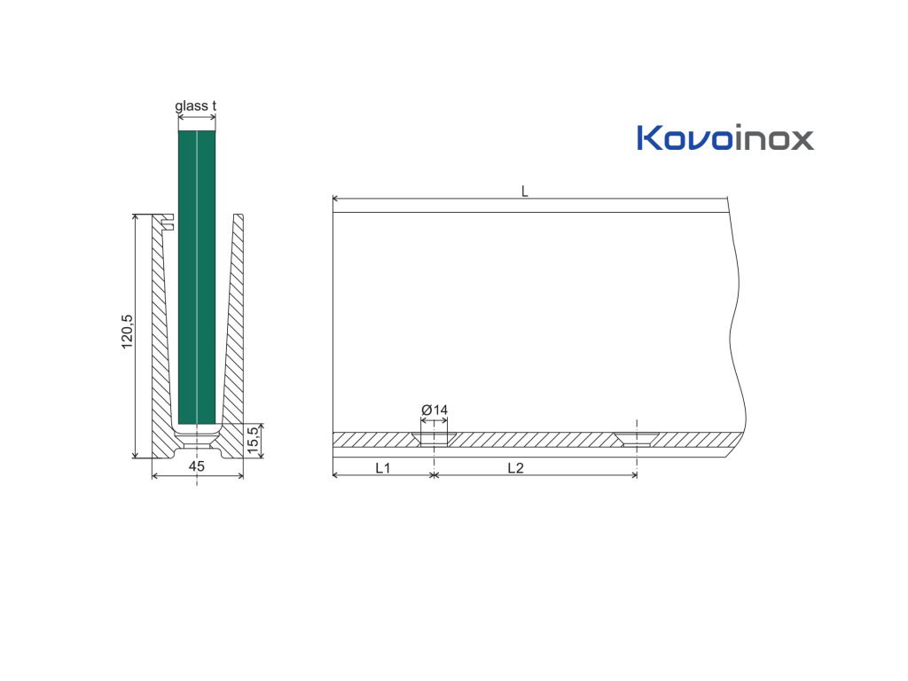 Hliníkový spodný kotviaci profil na sklo 12-22mm, dĺžka: 6000mm, vrchné kotvenie, povrch imitácia nerezu